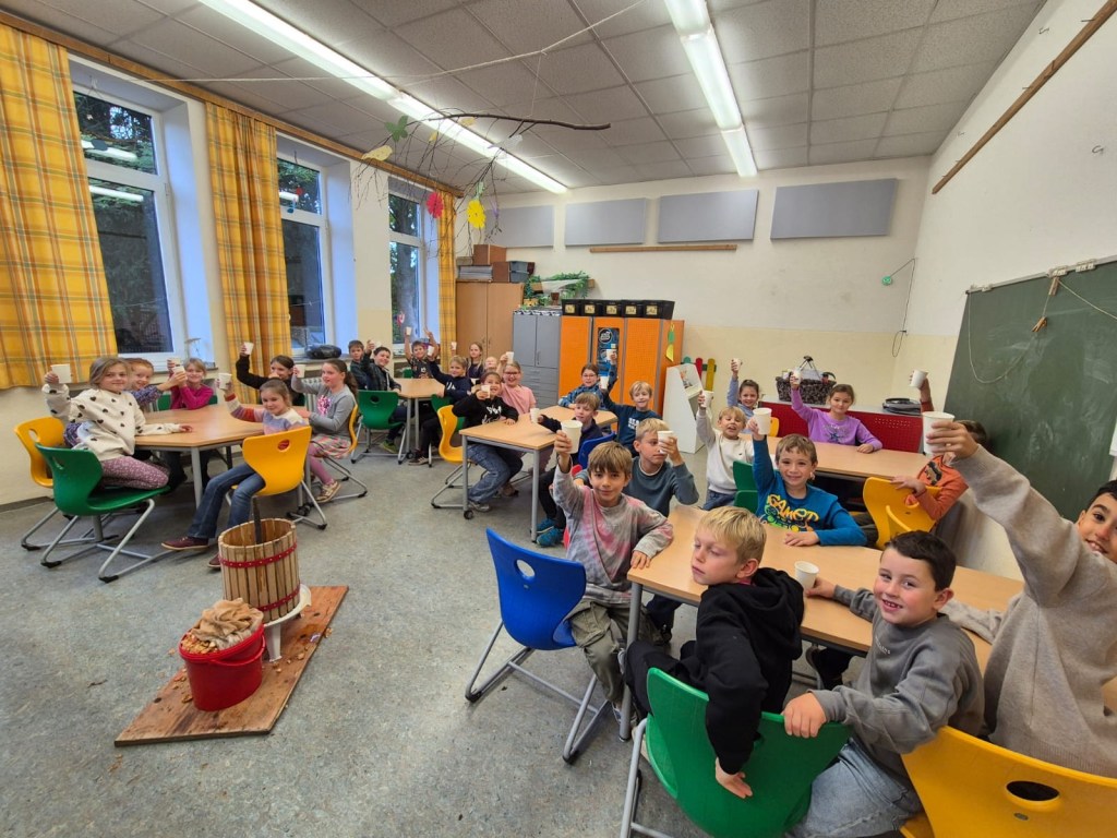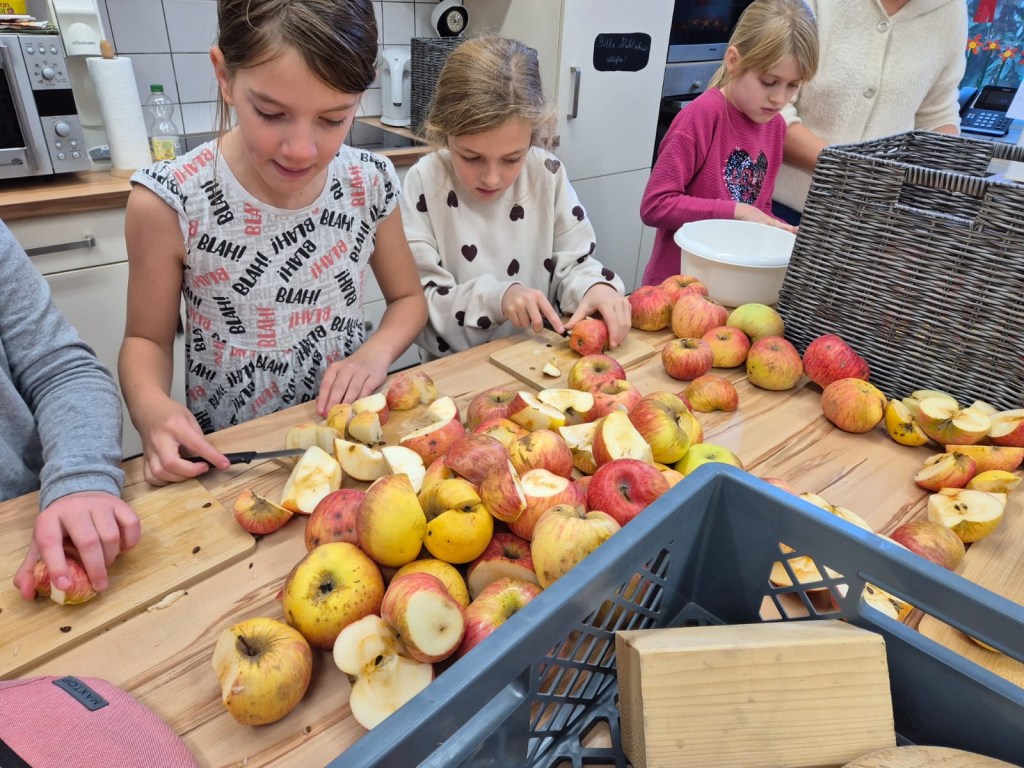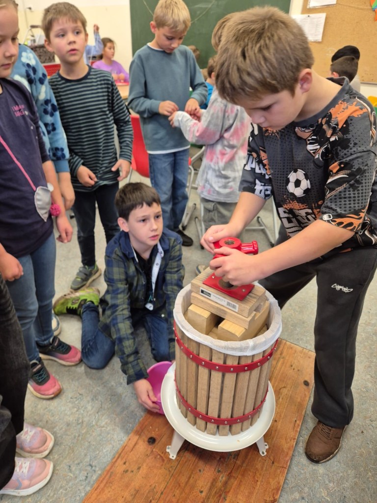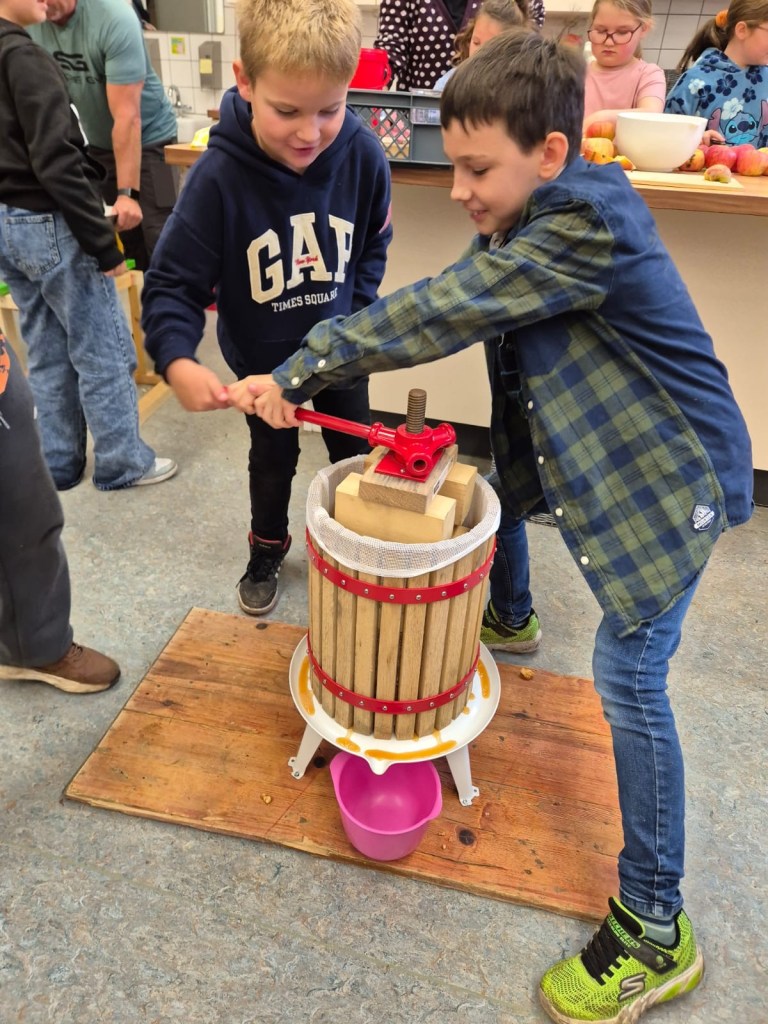 Wir haben heute Apfelsaft gepresst. Zuerst haben wir die Äpfel geschnitten. Dann kamen die Äpfel in die Obstmühle. Die Obstmühle hat die Äpfel klein gemacht. Danach haben wir die kleinen Äpfel in die Saftpresse geschüttet. Wir haben am Hebel gedreht, dann kam Saft raus. Das war schön und hat Spaß gemacht. Zum Schluss haben wir alle getrunken. Das war lecker!