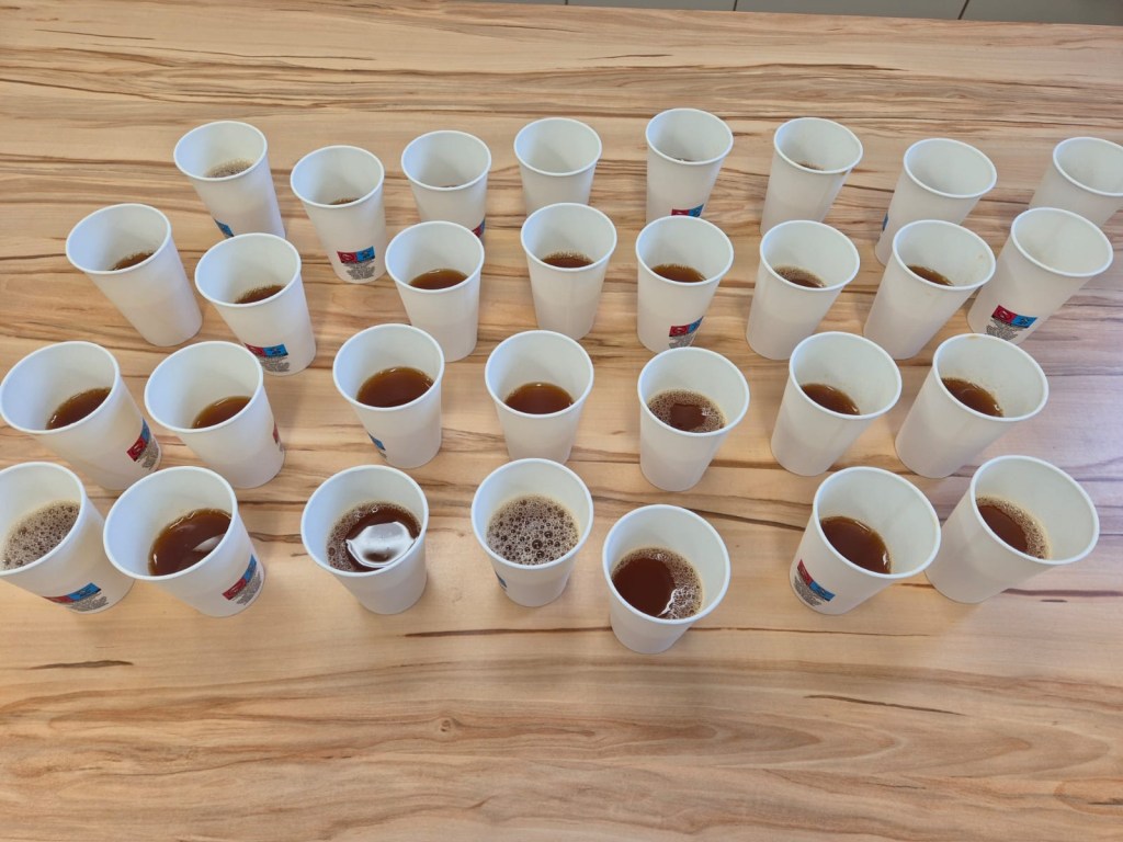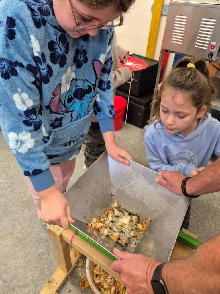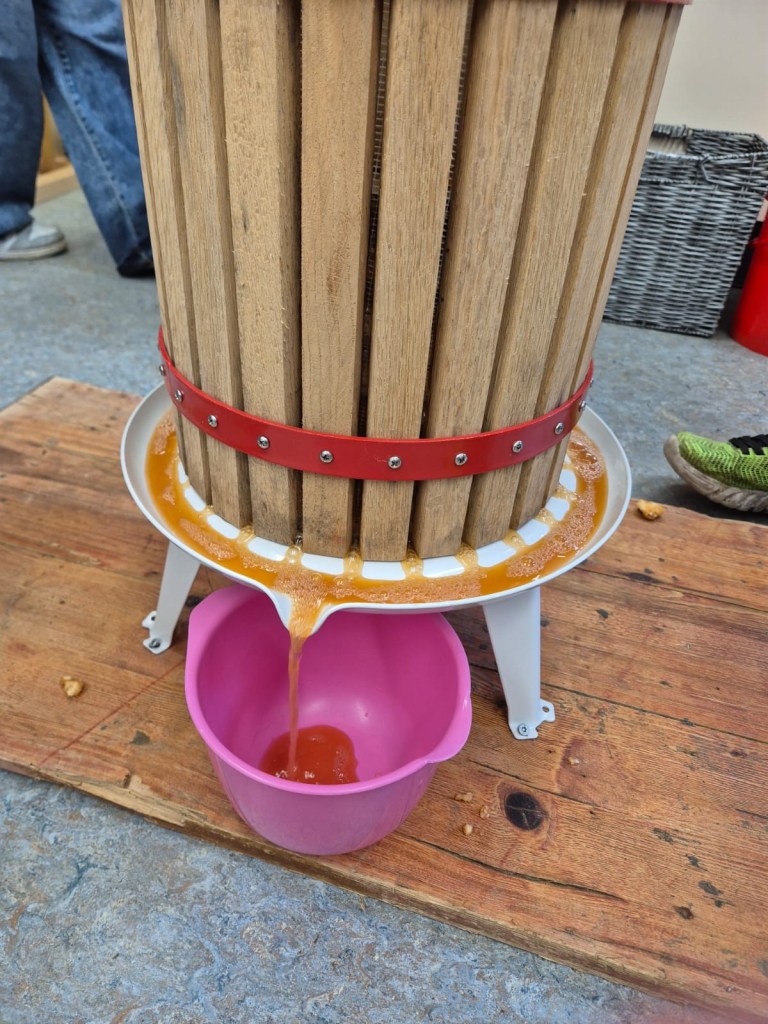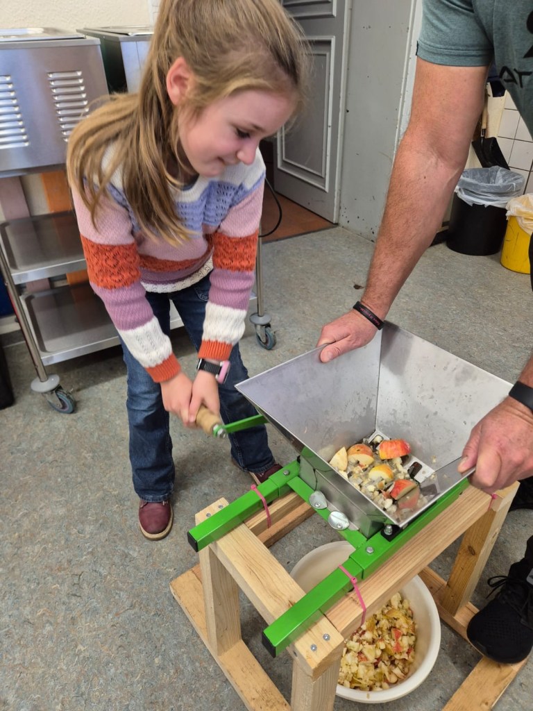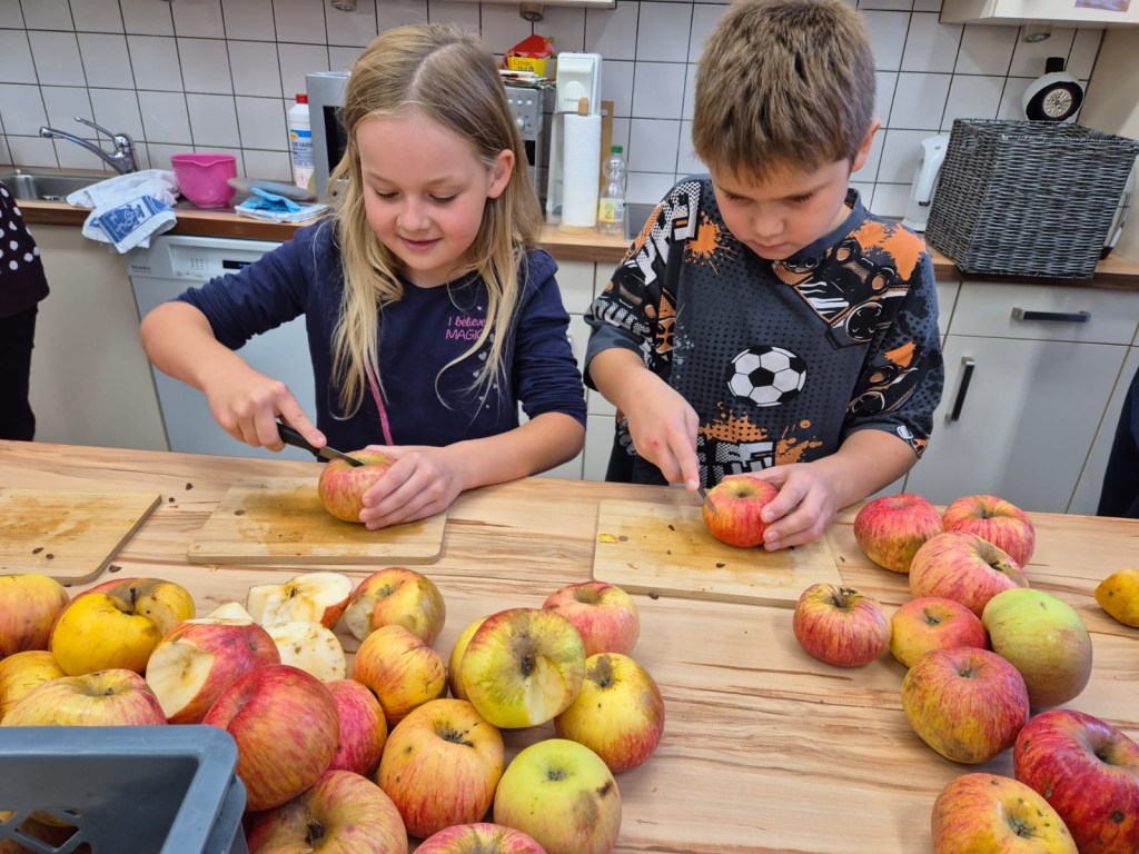 Wir haben heute Apfelsaft gepresst. Zuerst haben wir die Äpfel geschnitten. Dann kamen die Äpfel in die Obstmühle. Die Obstmühle hat die Äpfel klein gemacht. Danach haben wir die kleinen Äpfel in die Saftpresse geschüttet. Wir haben am Hebel gedreht, dann kam Saft raus. Das war schön und hat Spaß gemacht. Zum Schluss haben wir alle getrunken. Das war lecker!