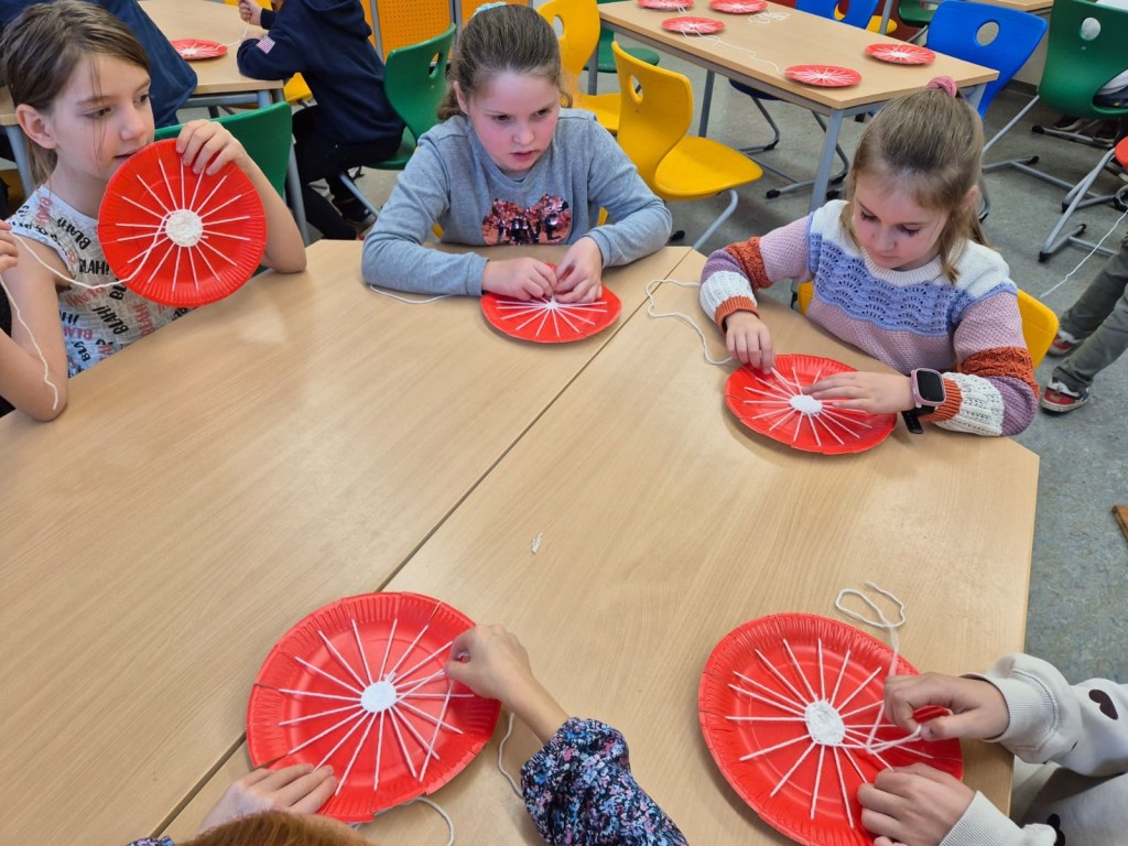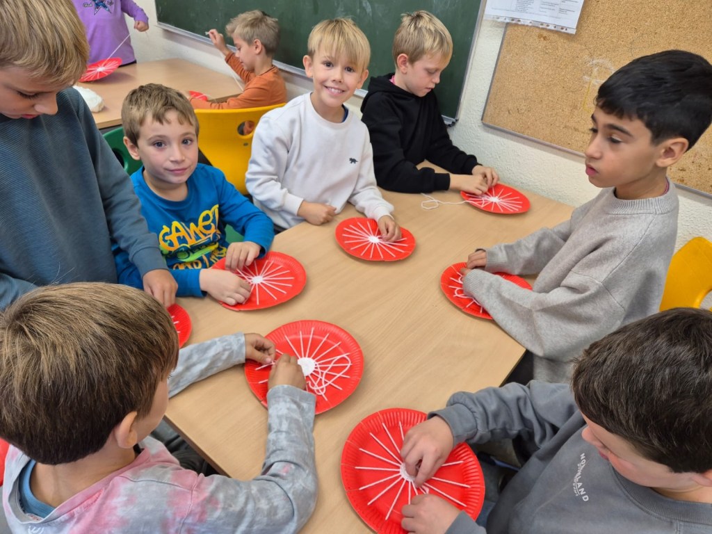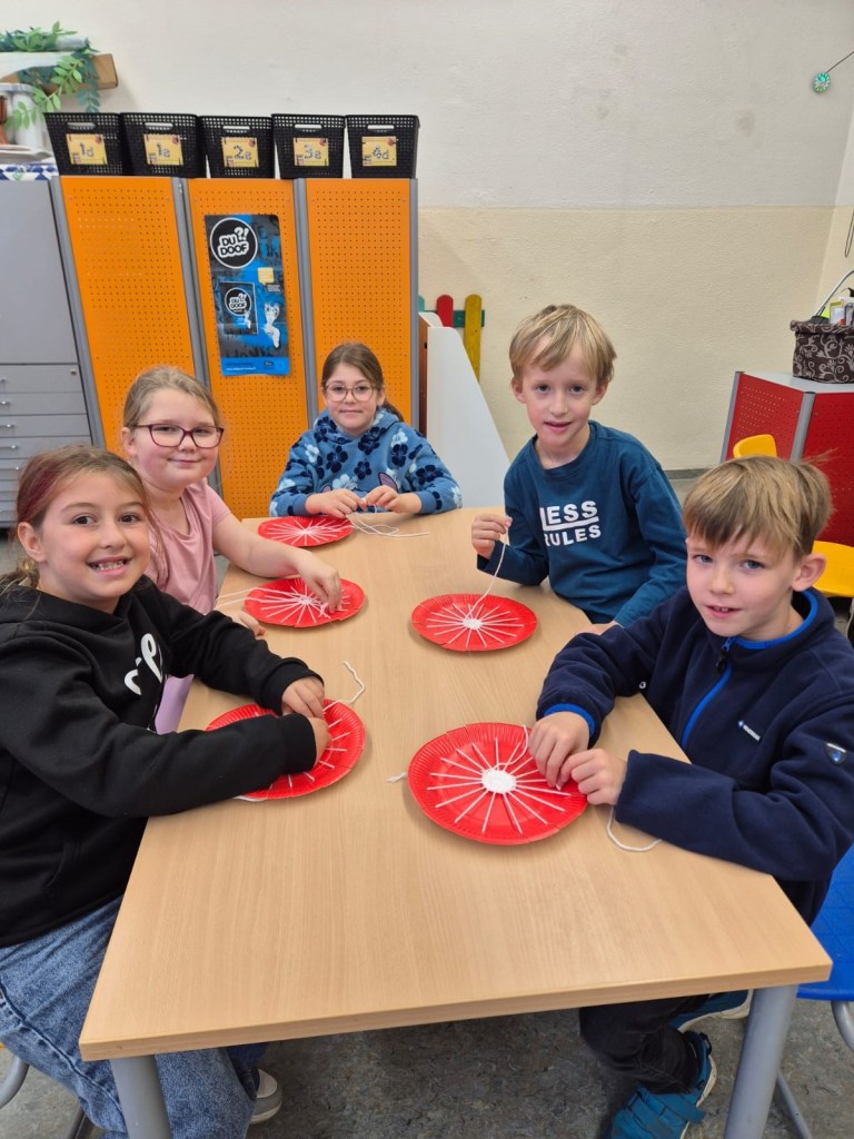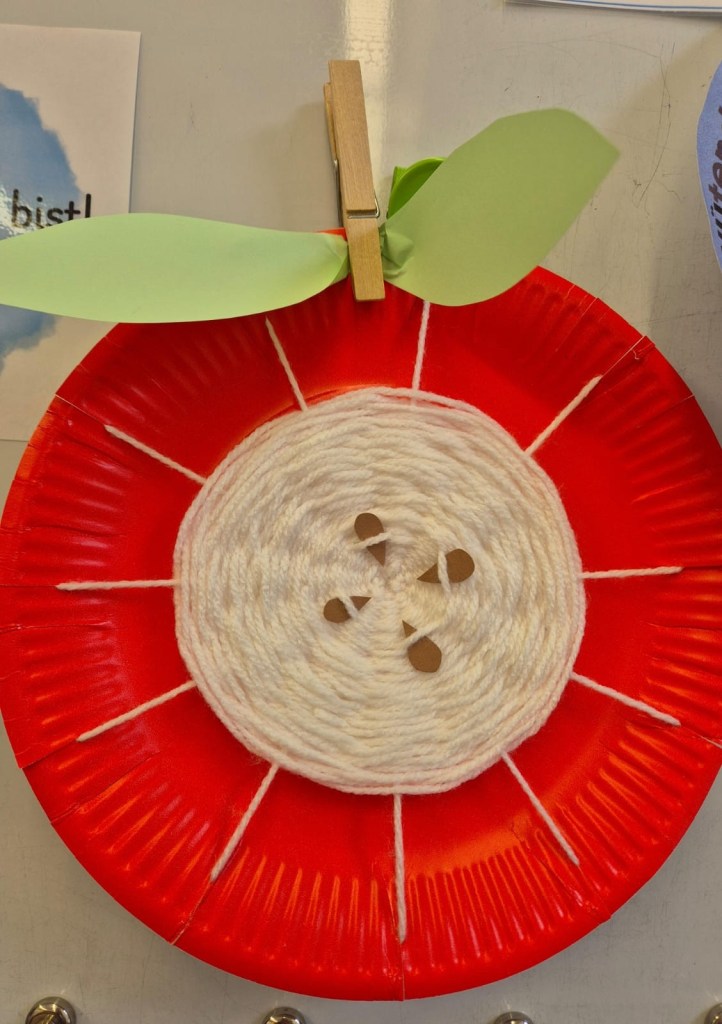 In Gruppen haben wir Apfelsaft gepresst. Außerdem haben wir Äpfel auf roten Papptellern gewebt. Dazu waren Schnüre auf den Papptellern gespannt. Ein langer Wollfaden wurde abwechselnd über und unter die Schnüre gefedelt. Das hat Spaß gemacht.