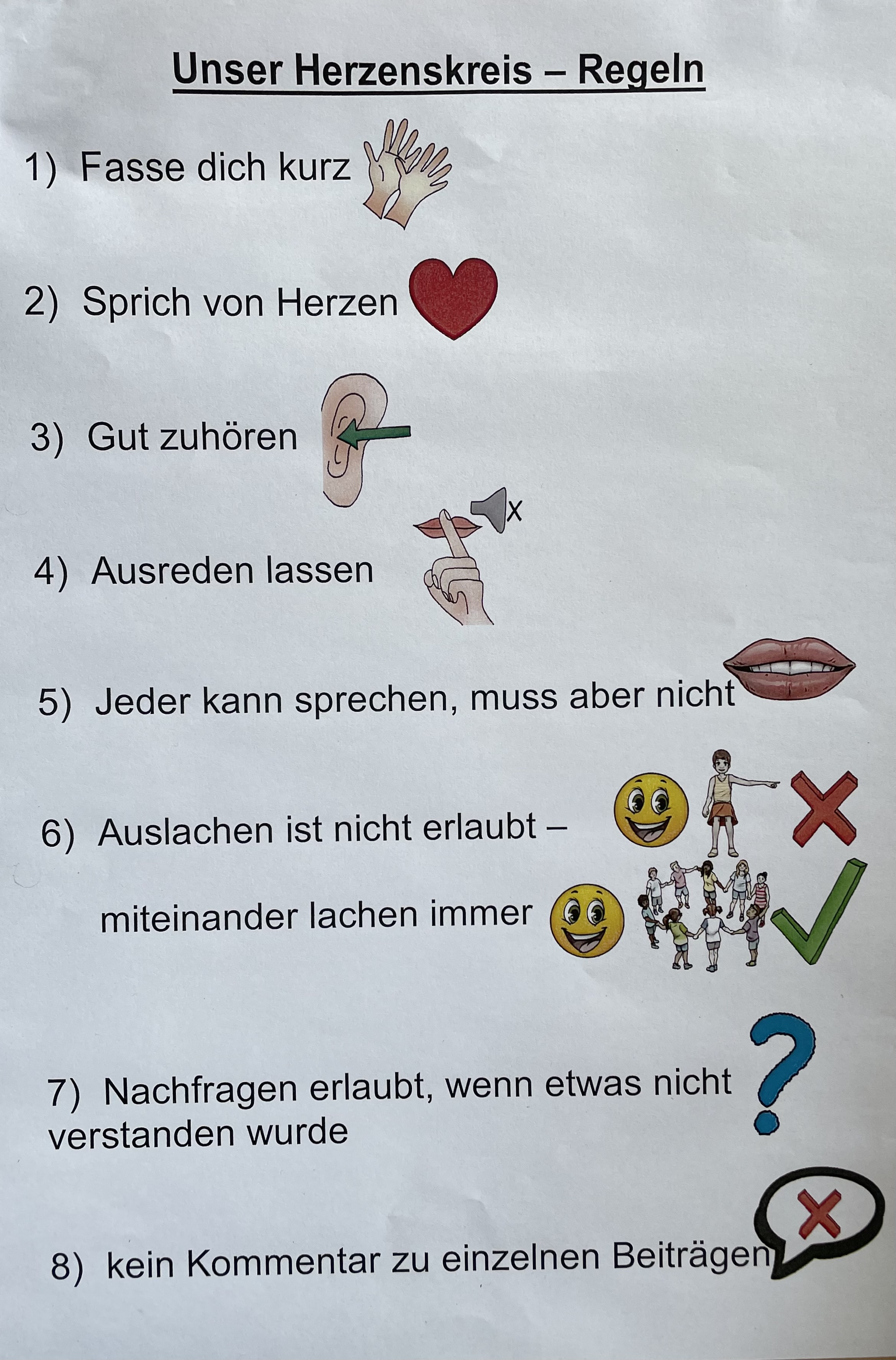 Jede Woche findet in den Klassen der sogenannte „Herzenskreis“ statt. Hier darf jeder einmal äußern, was er „auf dem Herzen“ hat und/oder was ihm besonders gut gefällt. Der Herzenskreis ist auch ein Teil des Bensberger Meditations-Modells (BMM).