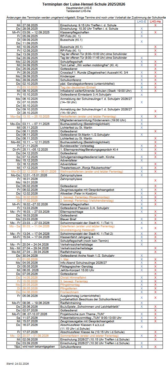 HomeKontaktImpressumDatenschutzAktuellesTermineUnsere SchuleDie schuleKollegiumUnterrichtszeitenVorbereitungsklassenSchülerbüchereiLuise HenselSchullebenOGSFür ElternSchulpflegschaftFördervereinElternlotsenMini-SchuleBeurlaubungenSchulordnungKontakt Terminplan der Luise-Hensel-Schule 2025/26 2026-02-24-Terminplan-LHS-2025_26Herunterladen ImpressumDatenschutz
